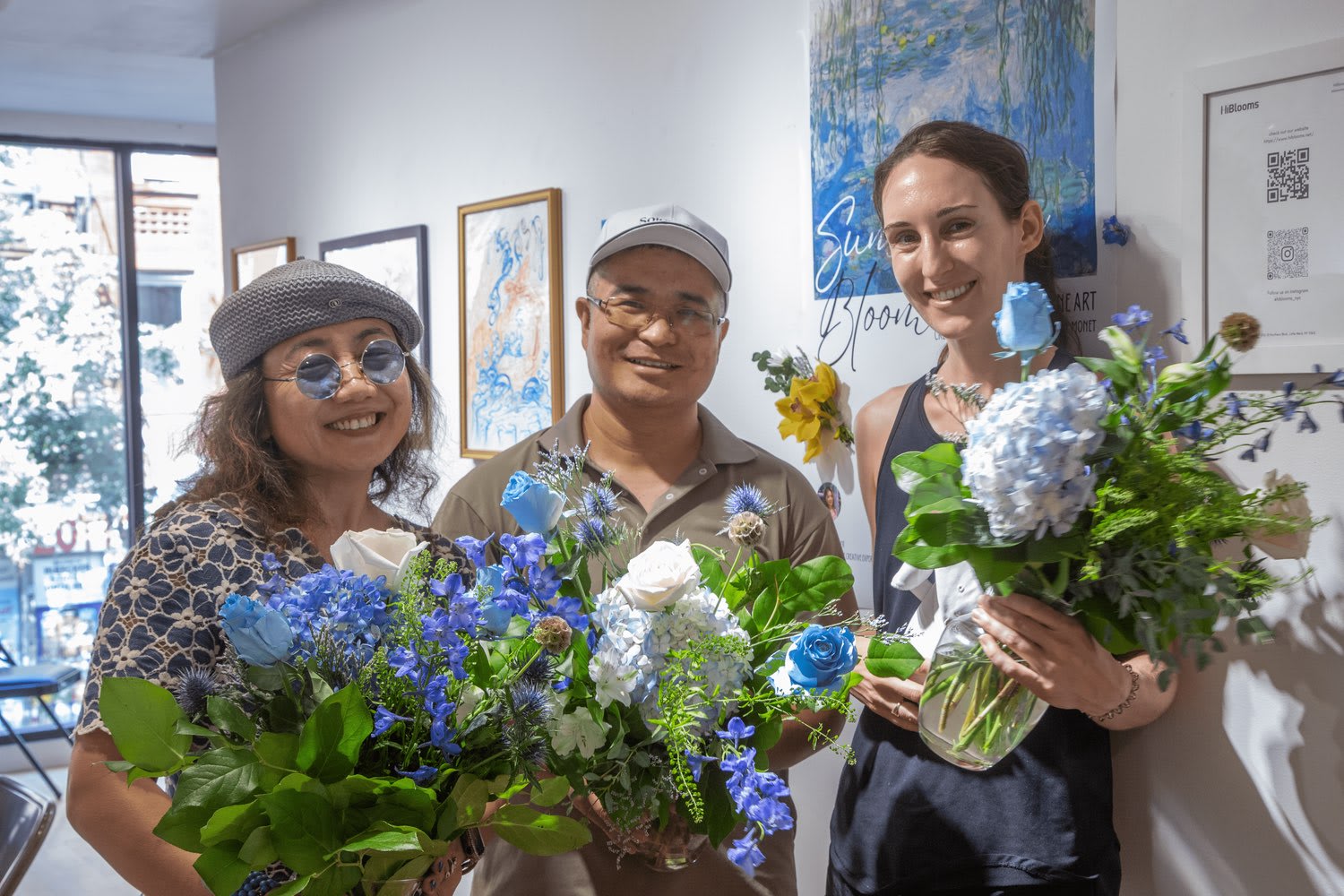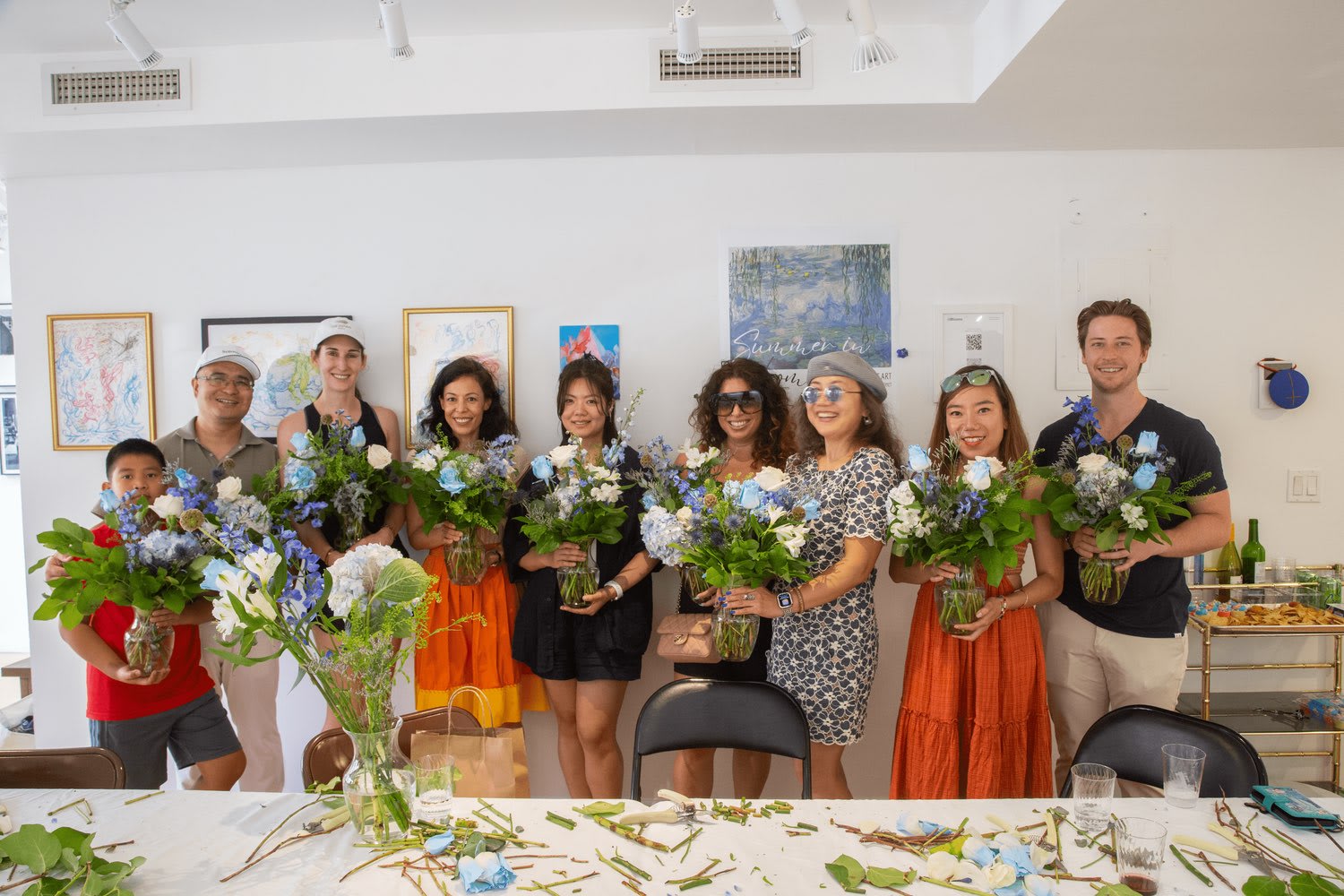 An all-inclusive experience, Summer in Bloom welcomed everyone — from seasoned flower lovers to curious first-timers (yes, even dads and kids!). Each participant created their own impressionist bouquet, guided by floral designer Vivi, using curated seasonal florals echoing the tones of water, sky, and bloom.
